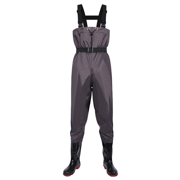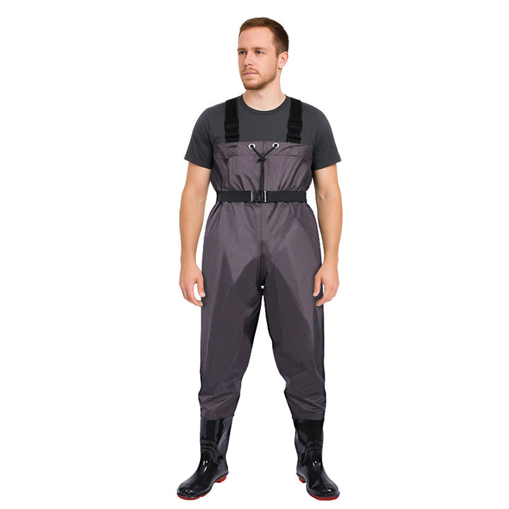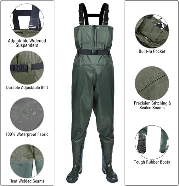 These 100% waterproof waders feature a durable nylon body, reinforced boots, and heat-sealed seams to keep you dry during long days in the water. The thickened PVC boots are built for outstanding durability, with anti-slip and anti-abrasion properties to extend the waders' lifespan. Designed for comfort and convenience, they include adjustable H-style suspenders with buckles, a waist belt, a drawstring cord, and a zippered chest pocket. Perfect for fishing, hunting, farming, or any messy outdoor activity, these waders keep you warm and dry, available in sizes 7 to 13. For care, simply rinse with fresh water (no brushing) and hang dry in the shade—avoid direct sunlight.