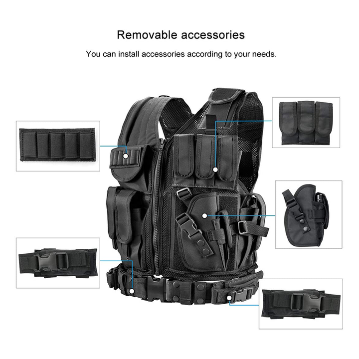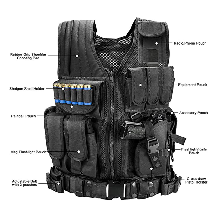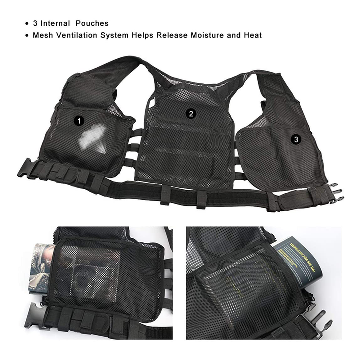 The signature mesh ventilation system is breathable, keeping moisture and heat at bay. Nine back loops easily handle a medical kit or a water bladder, distributing weight evenly between the back and chest. Velcro on the shoulders and front simplify modifications, so you can configure the vest for maximum comfort and ease. There is a pouch for a mic or a radio on the left shoulder. The front utility zipper is heavy-duty and durable, while concealed zippers inside the chest accommodate concealed plates.